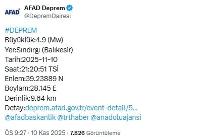 AFAD yaptığı açıklamada depremin büyüklüğünü 4.9 olarak açıkladı.